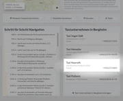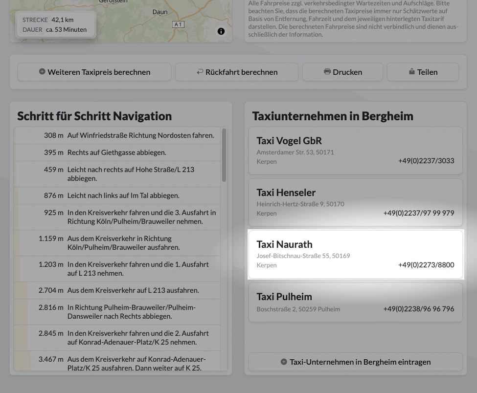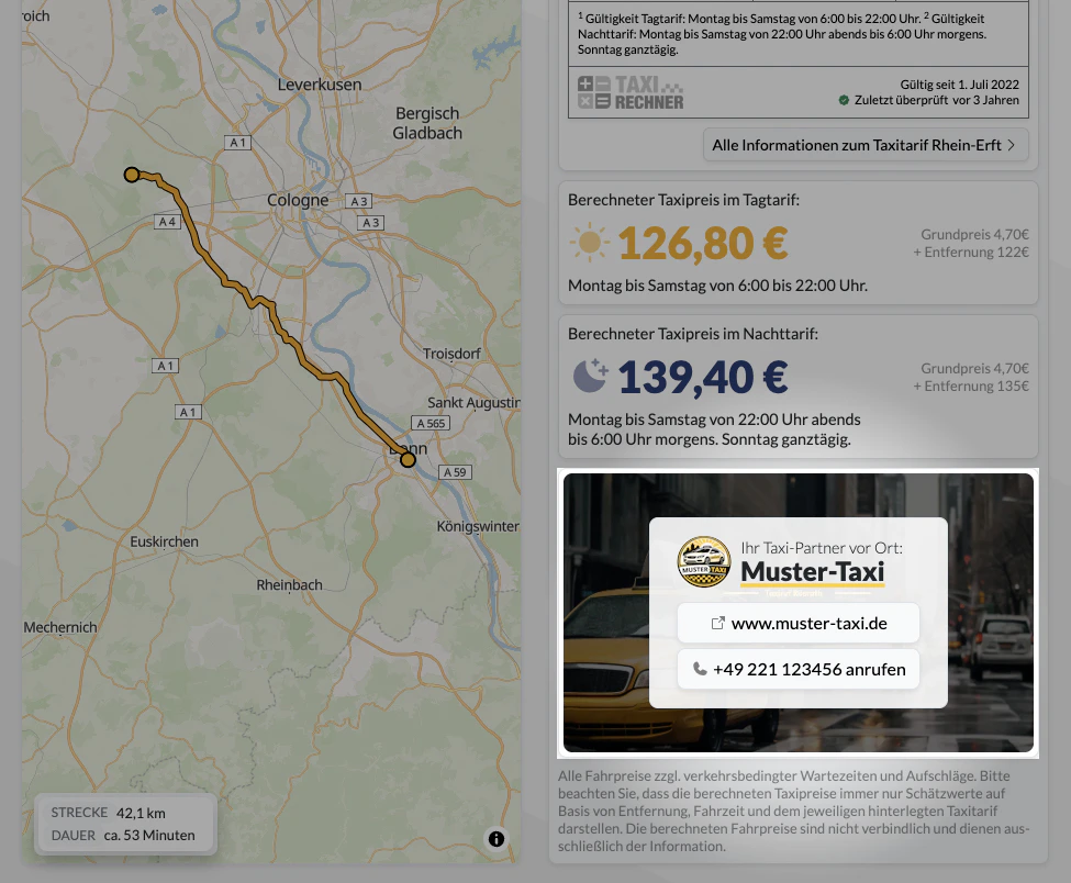 - Ergebnisseiten, direkt unter den errechneten Taxipreisen,